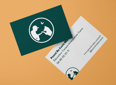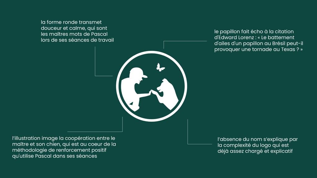 Pour le logo j'ai voulu imager la coopération et l'entente entre le maître et son chien, qui est au coeur de la méthodologie de renforcement positif qu'utilise Pascal dans ses séances. Pour compléter le logo et lui donner un certain équilibre, nous avons ajouté un papillon qui fait écho à la citation d'Edward Lorenz : « Le battement d'ailes d'un papillon au Brésil peut-il provoquer une tornade au Texas ? ». En effet, son approche comportementale repose sur ce principe, à savoir que tout geste effectué, toute émotion transmise, même par inadvertance, en présence de votre chien pourra avoir un impact sur son comportement.